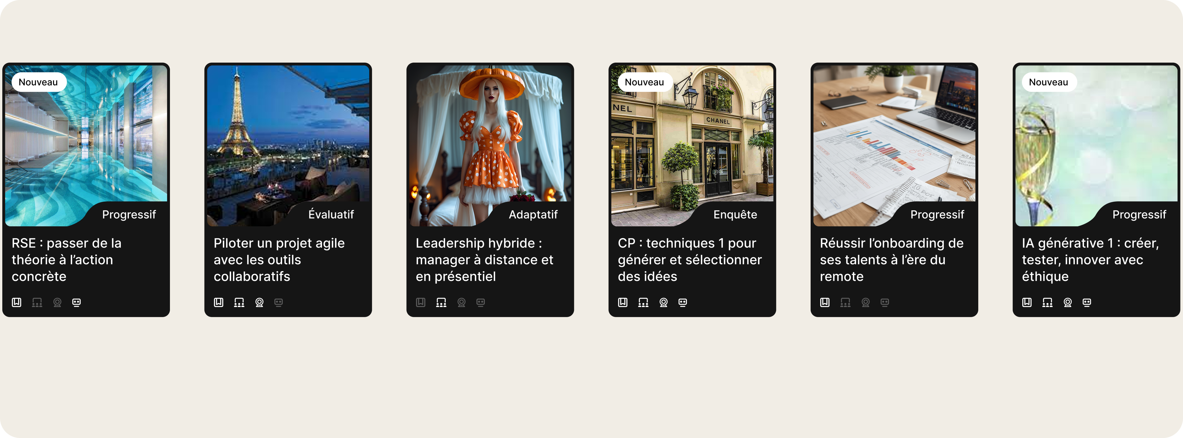 Vignettes parlantes (durée, niveau, format), prévisualisation et duplication instantanée.